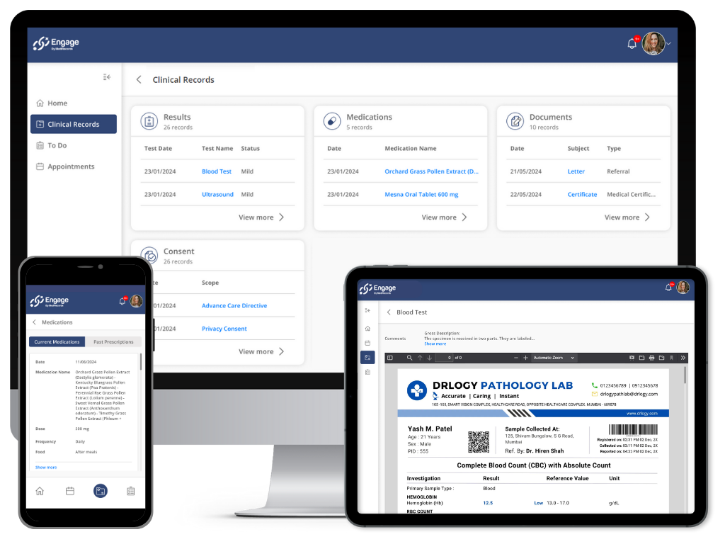 The MediRecords Engage portal is an integrated web-based platform that enables patients to actively participate in their healthcare journey, manage appointments and provide records of consent.